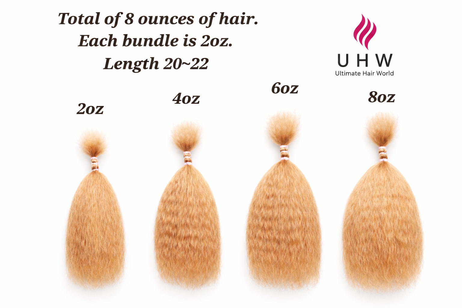 - Bulk Hair lengths are: 18”-20″, 20″-22″, 22″-24″